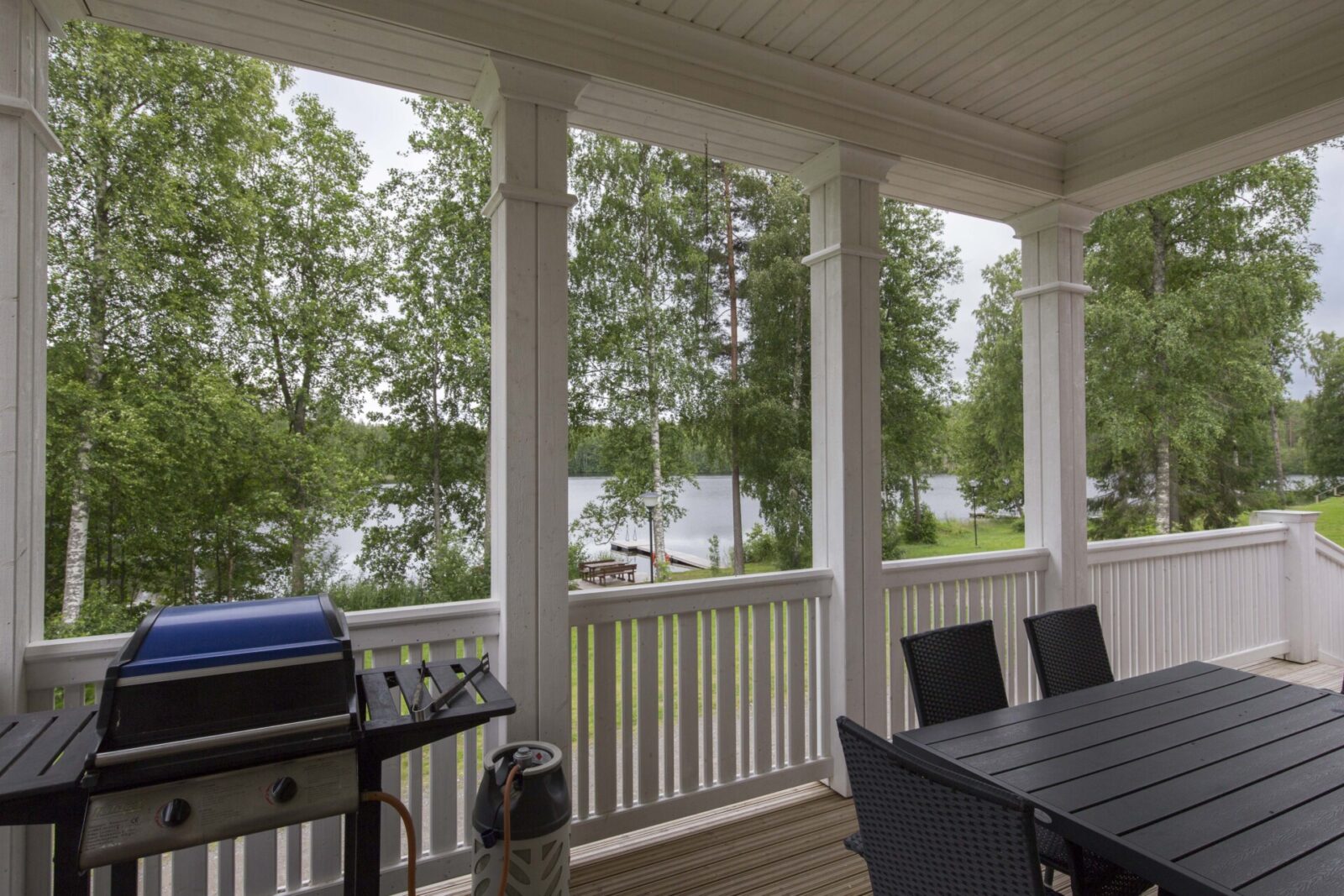 The villa consists of three bedrooms, a large living room with a kitchen, two bathrooms, a sauna, and a big veranda with view of the lake. On the veranda there is a large dining table and gas grill, two entrances one to the living room and one to the sauna.