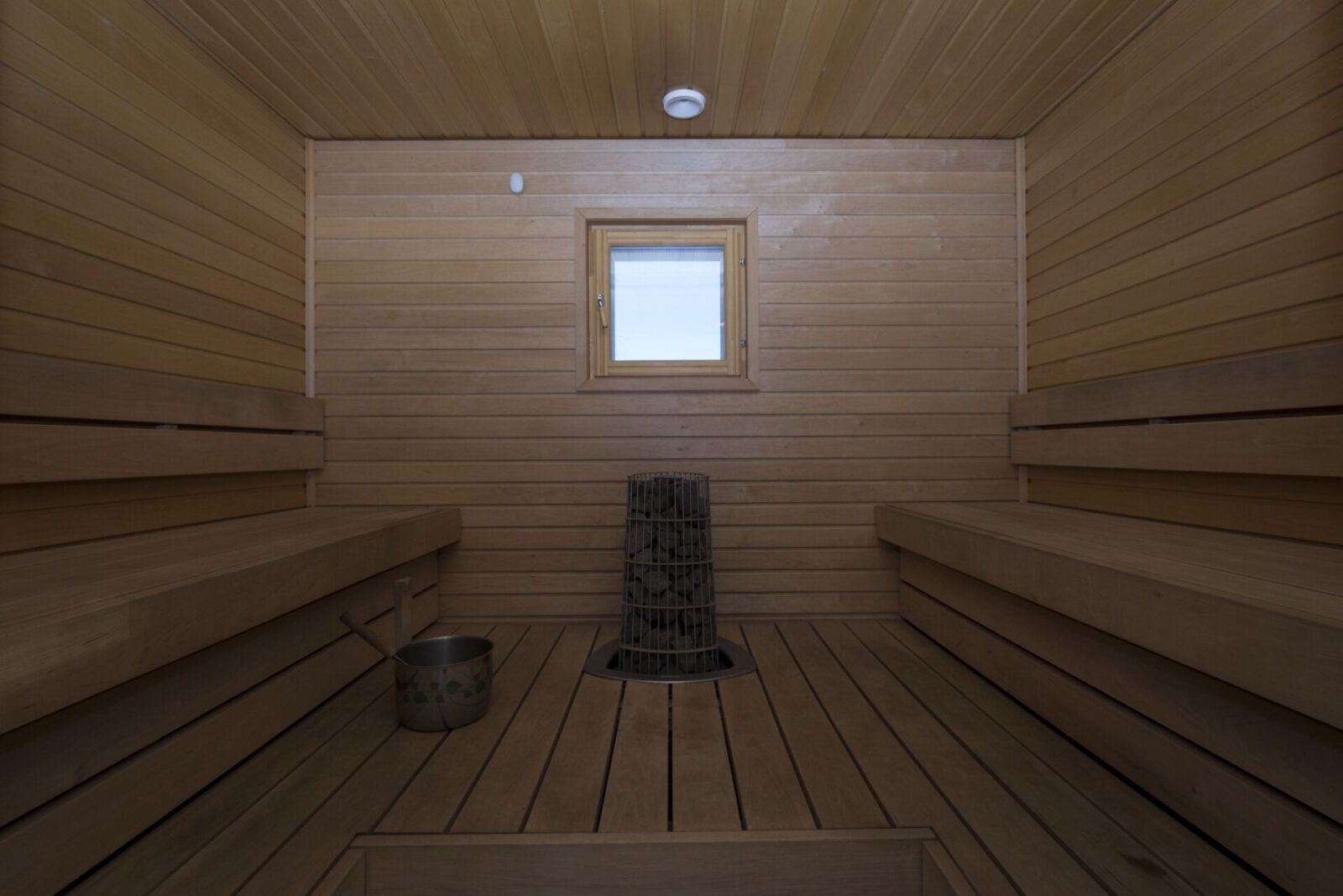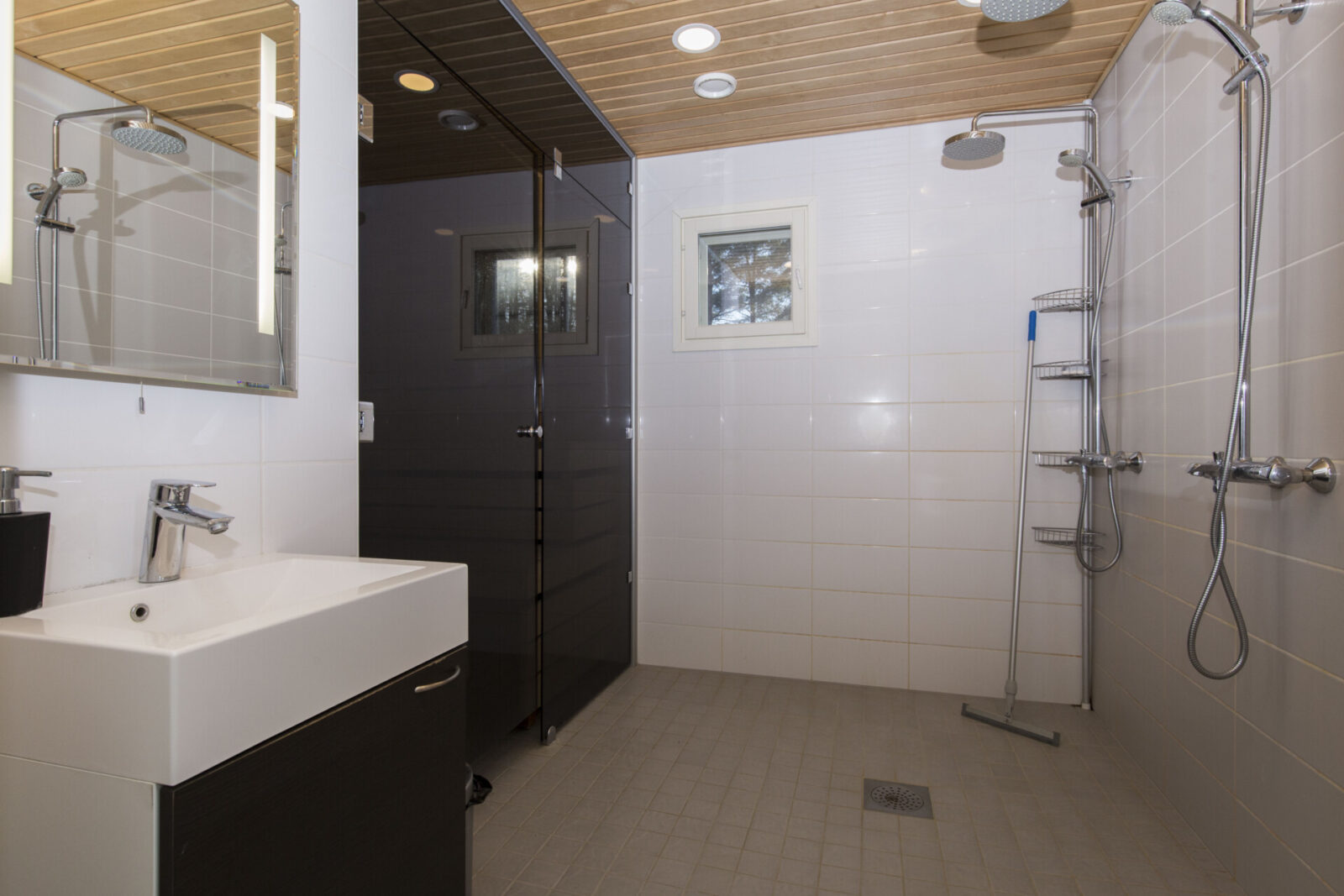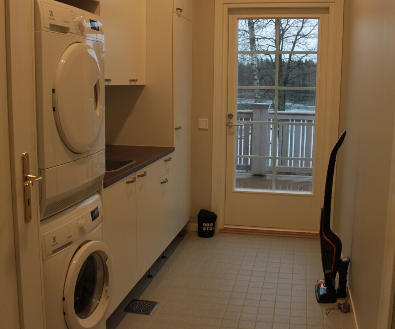 Huvilassa on oma sauna ja pesuhuone sekä kodinhoitohuone pesutornilla.